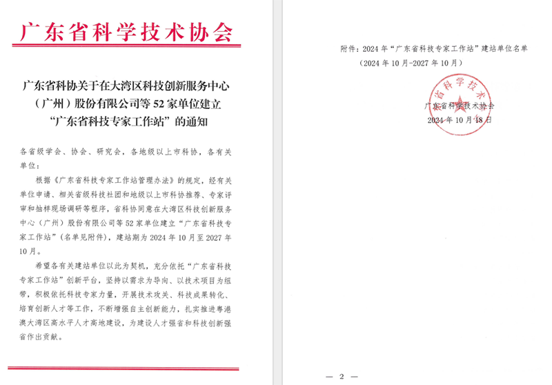 近期,广东省科协公布《广东省科协关于在大湾区科技创新服务中心(广州)股份有限公司等52家单位建立“广东省科技专家工作站”的通知》。