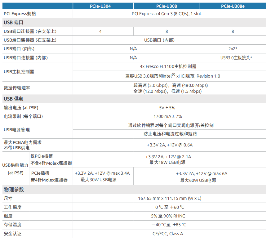 2、更可靠的设计。电源过电压、过电流保护;USB电源开/关,可编程控制USB电源, 用于USB 3.0摄像头恢复;每个端口的USB电源容量高达7.5W, 总功率为60W(PCIe-U308);工作温度从0°C到+60°C(32°F到140°F)。