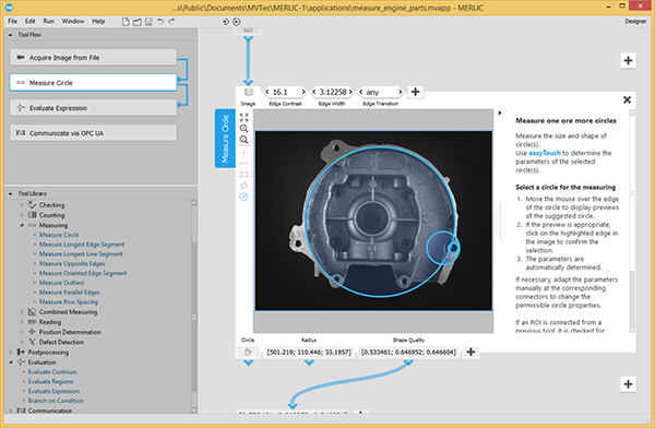 MVTec MERLIC 软件是一款一体化工具,无需编程即可快速构建机器视觉应用。凭借MVTec在机器视觉领域丰富的经验,并整合可靠、快速且易用等性能,这款PC-based 完整软件解决方案具备图形化的用户界面,能够直观地引导客户构建自己的应用。类似于所见即所得 (WYSIWYG, what-you-see-is-whatyou-get) 的编辑器,开发人员可以专注于图像的显示,而不是复杂的代码行或参数列表。MERLIC 软件特别适合需要顺利获得清晰的图形用户界面进行图像功能配置的应用。
